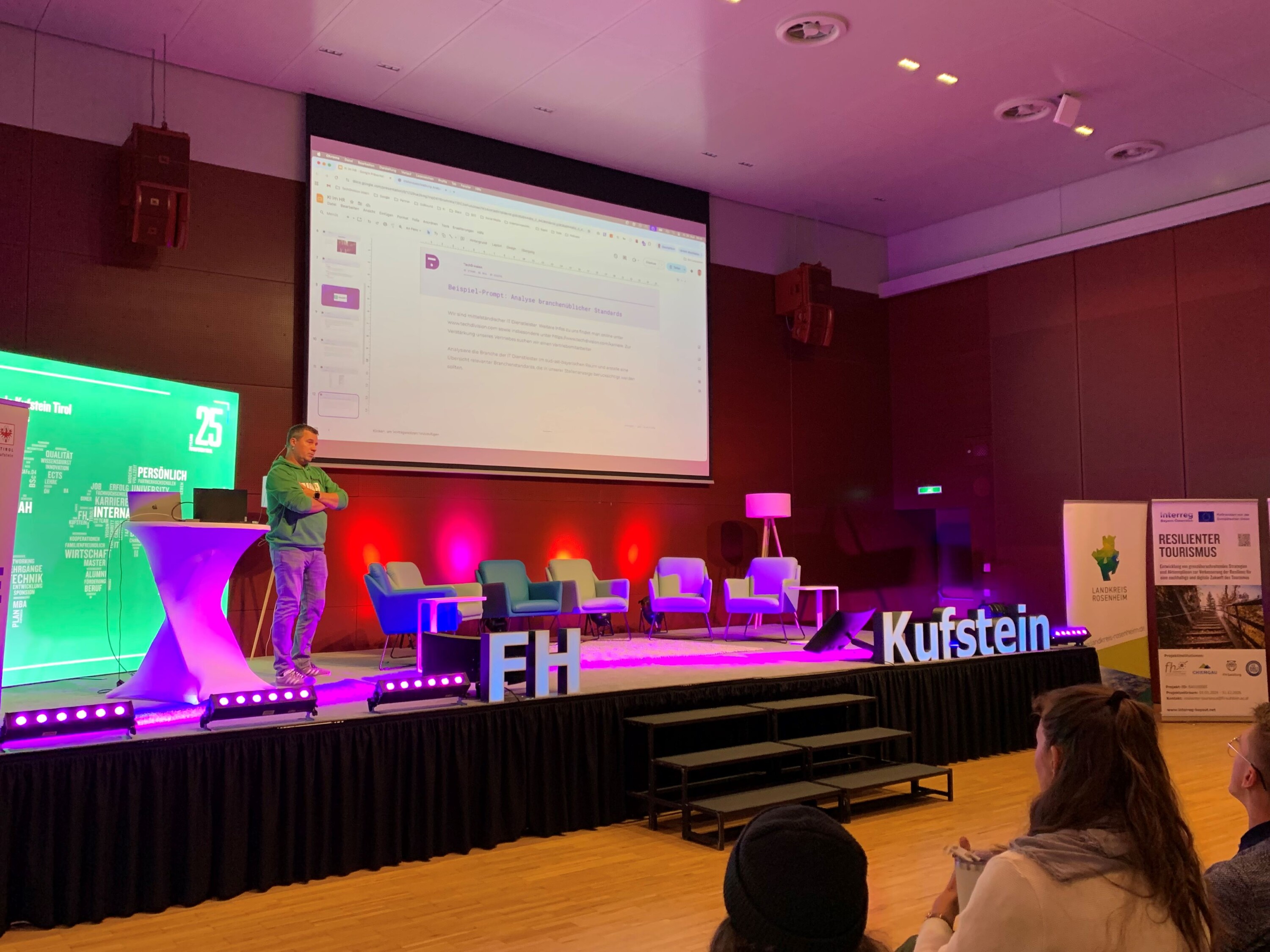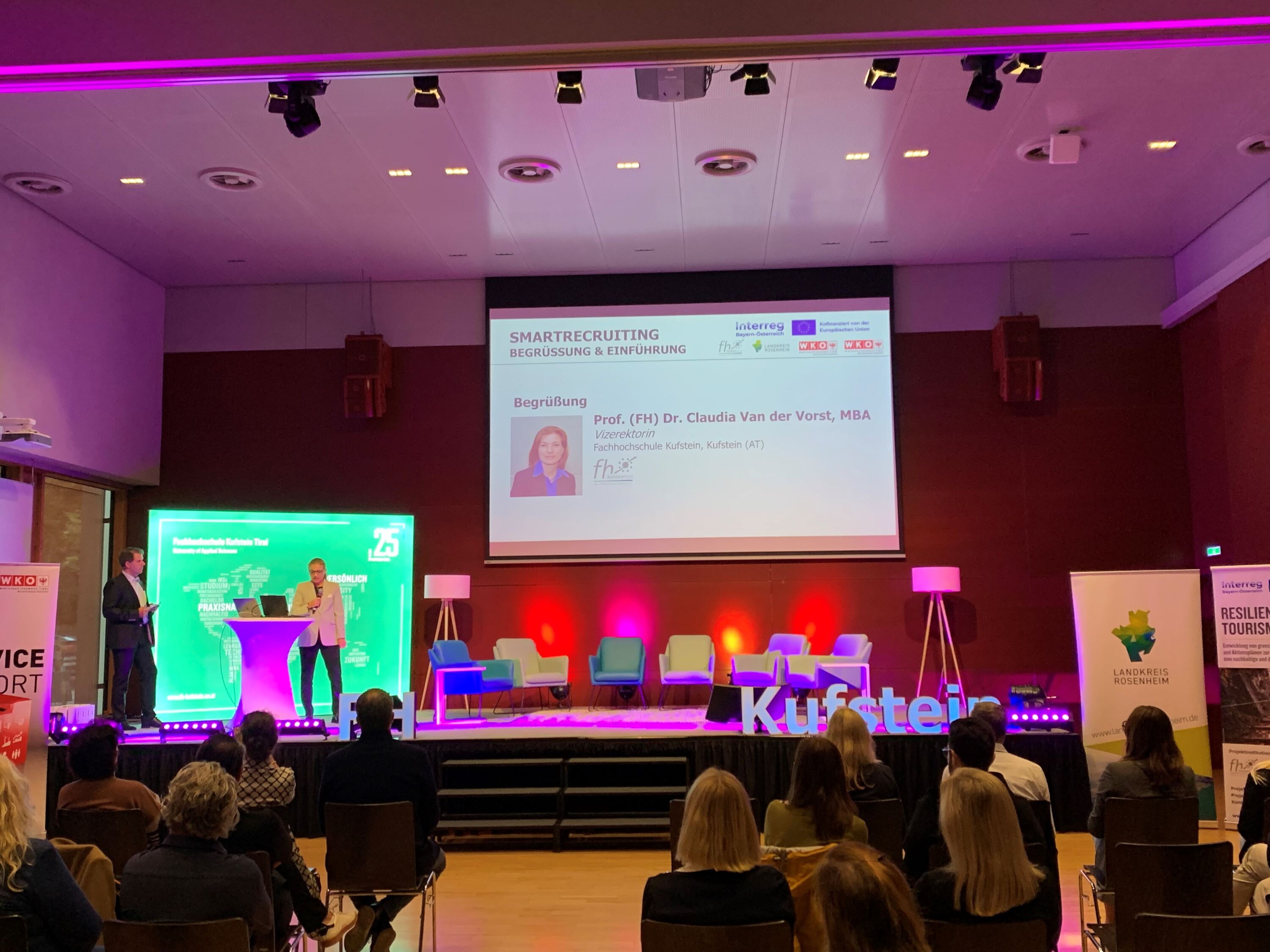 Vice Rector Prof. (FH) Dr. Claudia Van der Vorst kicked things off with a warm welcome to the audience and partners. The event partners then also addressed the audience with words of welcome: Peter Heßner (Head of Economic Development for the Rosenheim district), Sonja Altenburger (Chairwoman of the Kufstein District Chamber of Commerce), and Hermann Huber (Chairman of the Kitzbühel District Chamber of Commerce) emphasized the importance of modern recruiting strategies and attracting skilled workers to the region.