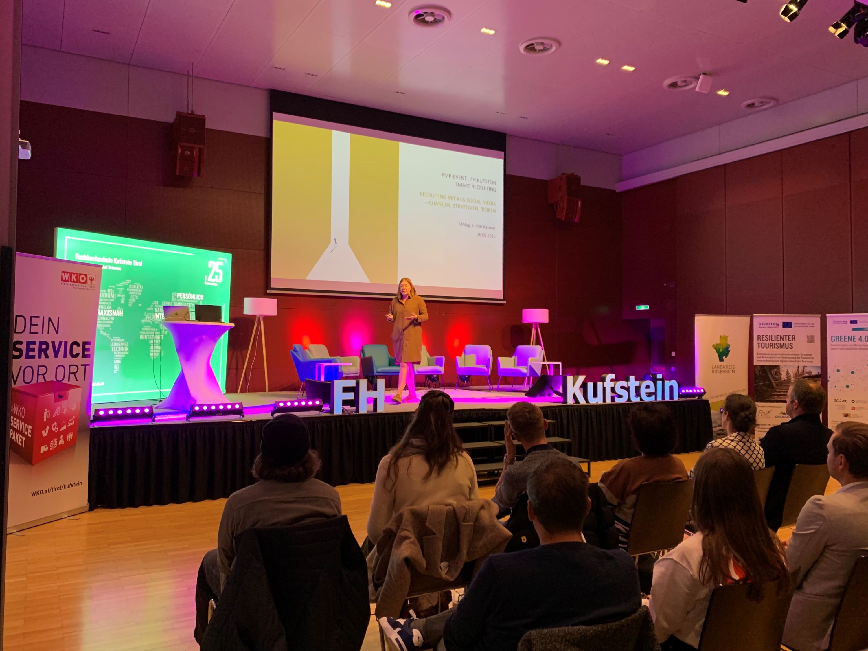 On 26 September 2025, the FH Kufstein Tirol hosted a specialist event entitled Smart Recruiting – Digitalisation & Social Media for Attracting Employees and Skilled Workers. Around 60 participants from Tyrol and Bavaria attended lectures and a workshop to gain practical insights into how companies can use artificial intelligence (AI) and social media to strengthen their employer brand and attract suitable talent.
