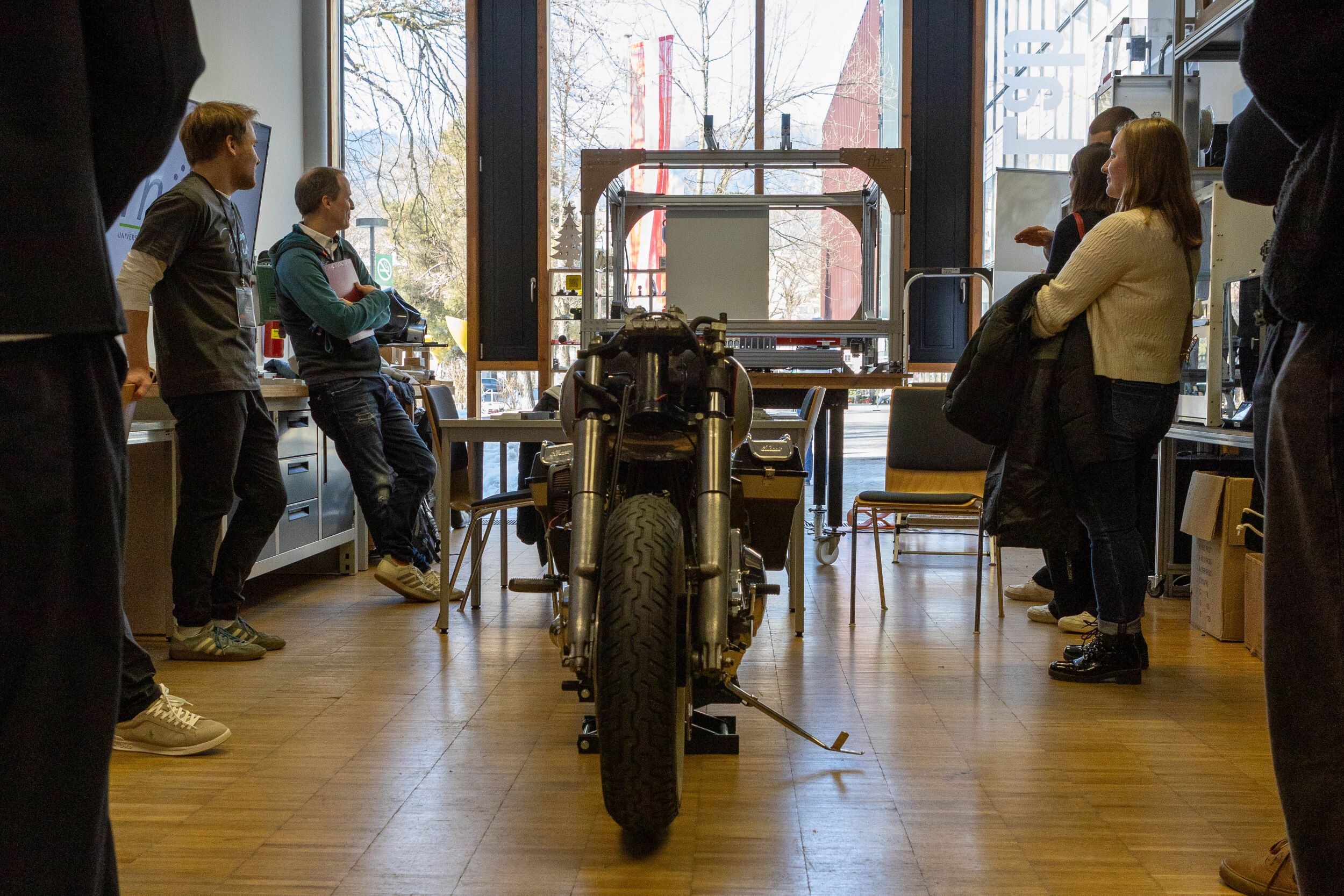 Ein besonderer Anziehungspunkt war auch der Blick in die hauseigene Tiny-Torquer-Werkstatt der FH Kufstein Tirol. Dort präsentierte Prof. (FH) Dr. Christian Schmid, Professor für Produktentwicklung im Studiengang Wirtschaftsingenieurwesen und Initiator der Tiny Torquer, sowohl bereits fertiggestellte Mini-Motorräder als auch Modelle, die sich aktuell noch in der Fertigung befinden. Genau in diesen Räumlichkeiten werden die Bikes selbst konstruiert, gebaut und zusammengeschweißt.