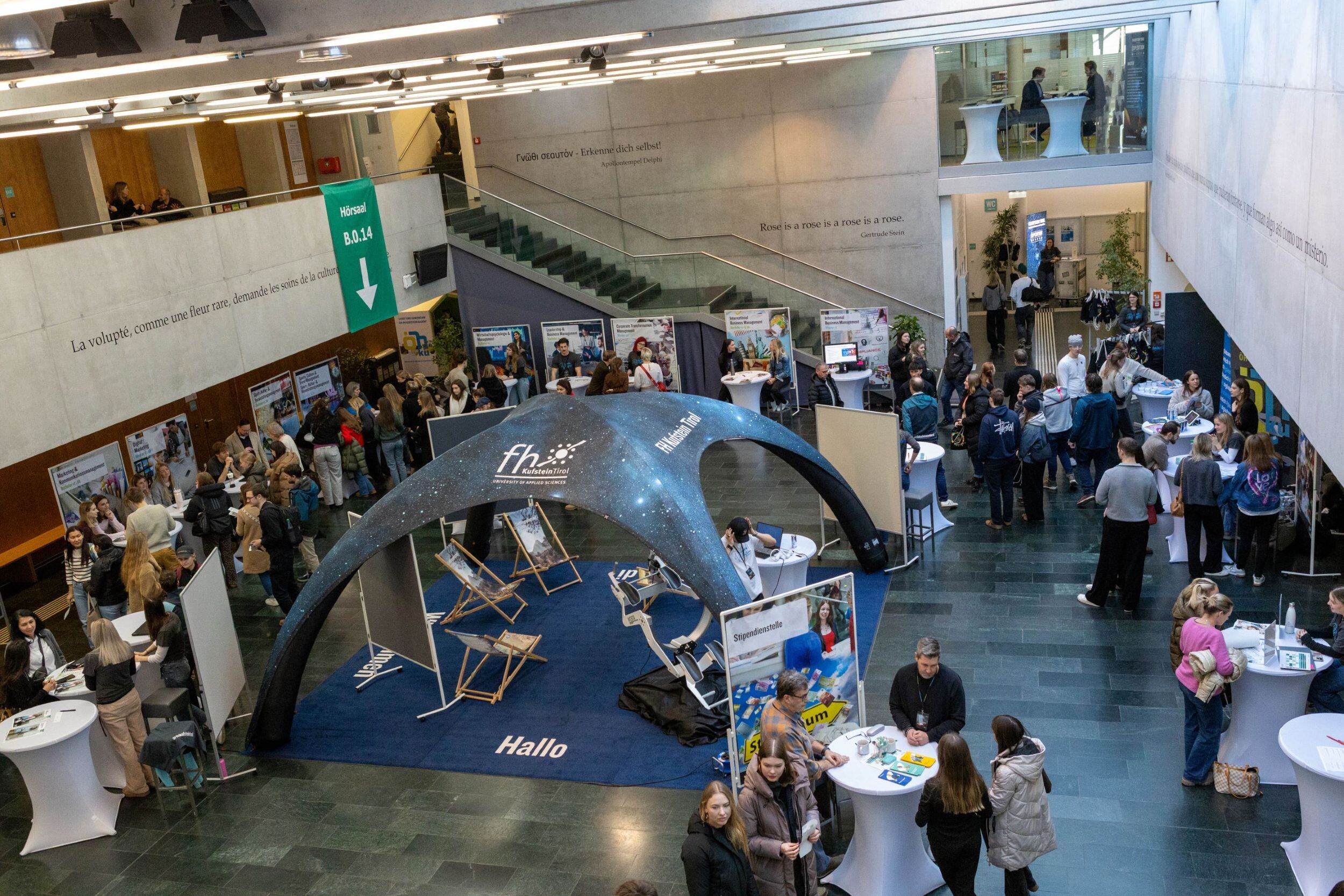 Blick in die gut besuchte Aula der FH Kufstein Tirol. 279 Besucher:innen nutzten die Gelegenheit und informierten sich aus erster Hand über das Studienangebot der Hochschule.